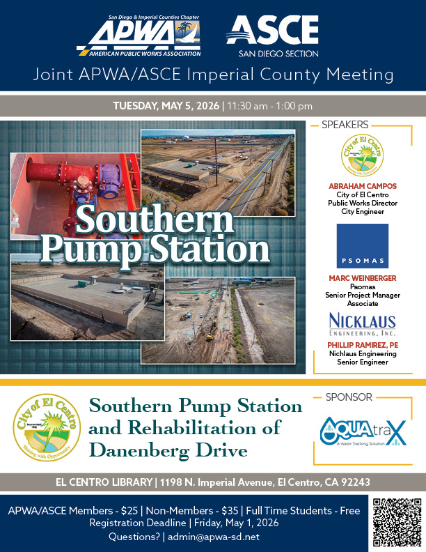 DOWNLOAD FLYER Register Now Venue El Centro Library1198 N. Imperial AvenueEl Centro, CaliforniaUnited States Related Events April 21, 2026 APWA Accreditation Open Forum: “One Size Does F... Register Today April 23, 2026 MSA/APWA Roadeo Register Today April 23, 2026 APWA April 2026 North County Tour – City ... Register Today