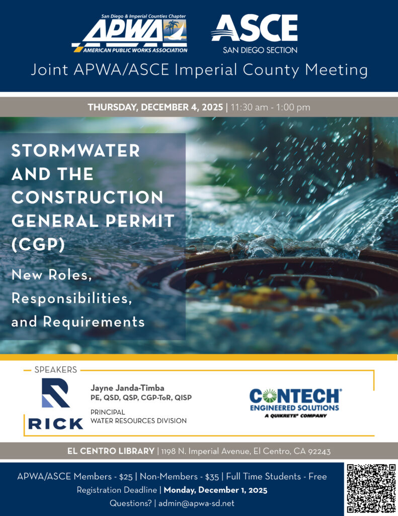 Venue El Centro Library1198 N. Imperial AvenueEl Centro, CaliforniaUnited States Related Events March 12, 2026 APWA/ASCE Joint March 2026 Lunch Meeting –... Register Today March 18, 2026 APWA Transportation Committee – Leading t... Register Today March 19, 2026 APWA Transforming the Future of Solid Waste thr... Register Today